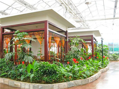 早期建設的生態溫室餐廳主要是利用生產型溫室輔以景觀設計而建造的,溫室外觀造型...